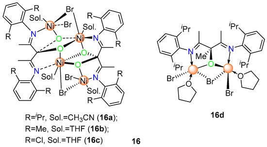 Tetranuclear nickel complexes 16a–c and binuclear nickel catalyst 16d.