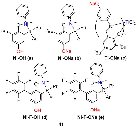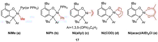 Jian et al. designed sterically bulky phosphino-phenolate Ni(II) catalysts 17a–e bearing five differed “Ni-C” initiating groups including “NiMe”, “NiPh”, “Ni(allyl)”, “Ni(COD)”, and “Ni(acac)/AlEt2Cl”, and demonstrated the important role for initiating groups in ethylene (co)polymerization (Figure 14) [108]. Catalysts 17a and 17b enabled the copolymerizations of ethylene with polar comonomers such as VTMOS, HCl, and n-butyl allyl ether (BuAE) to give polar functionalized PEs with incorporations of up to 1.28 mol% and high molecular weights (up to 66 kDa).