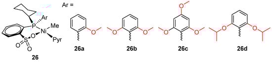 Jian et al. developed a series of asymmetric cyclohexyl (flexible)/aryl (rigid) substituted phosphine-sulfonate nickel complexes 26a–d (Figure 23) and comprehensively identified by varying number, position, and size of alkoxy groups on aromatic substituents of phosphine. The nickel promoted ethylene copolymerization with VTMOS and HCl and gave the incorporation of 3.7 mol% and 5.0 mol%, respectively, with the highest activity of 152.0 kg mol−1 h−1 achieved by 26c [129].