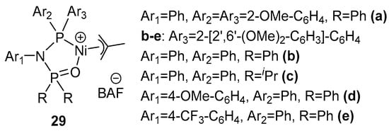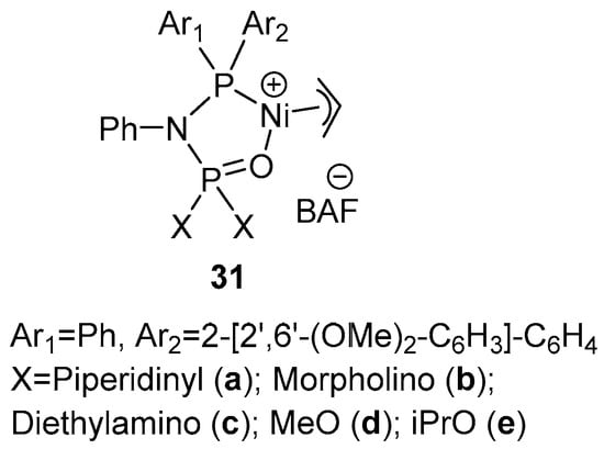 A novel family of cationic hemilabile N-bridged phosphine–carbonyl Pd(II) and Ni(II) catalysts 22a–f bearing various electronic nature and steric bulk were then prepared by Jian and studied for ethylene (co)polymerization (Figure 19) [114]. Not only preferred cationic Pd(II) catalysts but also the more challenging Ni(II) catalysts enabled ethylene copolymerizations with challenging polar vinyl monomers such as MA, AA, and n-butyl vinyl ether (BuVE) with good catalytic activities, molecular weights (14.1 kg mol−1), and comonomer incorporation (3.3 mol%), which adding a new and effective member to the electronically asymmetric P^O-type late transition metal catalyst family.