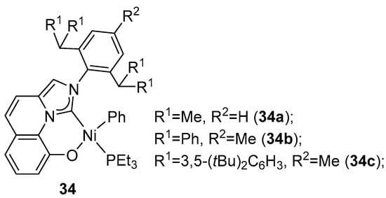 - Hameury, S.; de Frémont, P.; Breuil, P.-A.R.; Olivier-Bourbigou, H.; Braunstein, P. Bis(ether-functionalized NHC) Nickel(II) Complexes, Trans to Cis Isomerization Triggered by Water Coordination, and Catalytic Ethylene Oligomerization. Organometallics 2014, 34, 2183–2201. [Google Scholar] [CrossRef]
