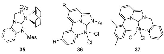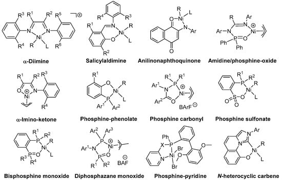 Nevertheless, the high cost and relatively low activity of palladium catalysts limit their practical utility, and their replacement with less expensive catalysts, such as nickel catalysts, would therefore be highly competitive [19,20]. Several nickel catalysts have been explored in recent years, with ligands that include α-diimine [21], α-imino-ketone [22], salicylaldimine [23], phosphine-phenolate [24], phosphine sulfonates [25], bisphosphine monoxide [26], N-heterocyclic carbene [27], and other specially designed ligands [10,11] (Scheme 2). There has been increasing research interest in nickel-mediated copolymerization of olefin with polar monomers, most of which rely on the manipulation of the electronic and steric effects of ligands. Further modification to these catalysts by Brookhart, Jordan, Nozaki, Shimizu, Carrow, Chen, Cai, Jian, Li, etc., led to enhanced catalytic properties. Reviews have been extensively summarized based on catalyst classifications by Chen [11,28,29,30], Jian [10,31,32], Nozaki [2,33], Li [34], Cao [35], etc., including advanced catalytic tuning strategies containing external stimuli [36] and secondary interactions [37,38,39,40], the coordination–insertion mechanism [3,41] containing the monomer poisoning effect [42] and the functions of custom-made polar monomers [31,32]. Except for the most challenging substrates such as fundamental polar monomers, a variety of nickel catalysts with bidentate ligands have also been developed for the effective copolymerization of olefins with non-vinyl polar monomers [33], including disubstituted ethene comonomers, ester-disubstituted carbene and CO [43,44,45,46], e.g., the nonalternating copolymerization of ethylene with CO to incorporate in-chain keto groups in polyethylene chains with high molecular weight while retaining desirable material properties [44].