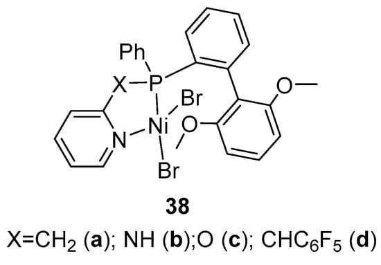Pellecchia et al. investigated a series of Ni(II) complexes 9a–d (Figure 7) with four pyridylimino ligands (either aldimine or ketimine) bearing different substituents at the pyridino and at the imino moieties [92] and tested them in the copolymerization of ethylene with MA, resulting in the production of low-molecular-weight hyperbranched copolymers with MA molar contents ranging between 0.2 and 35% and inserted in a variety of modes. The method of incorporation of the polar monomer went from “in-chain only” to “everywhere but in-chain” and was dictated by both the activation mode and the solvent used to dissolve the nickel precatalyst.