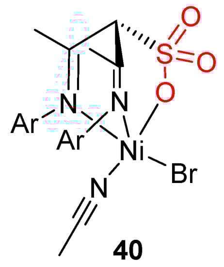 Chen et al. investigated the Ni catalyst 28a–e (Figure 25) for the copolymerization of ethylene with polar monomers bearing a long alkyl spacer (UCOOMe, HCl and 5-acetoxy-1-pentene (PAc)), in which the four positions (R1, R2, R3 and R4) could be independently adjusted, making it highly versatile to tune the properties of the metal catalysts. The copolymerization with activities of up to 1.5 × 105 g mol−1 h−1 could be achieved, along with moderate comonomer incorporations (0.2–3.3%) and moderate copolymer molecular weights (1200–27,000) [144].