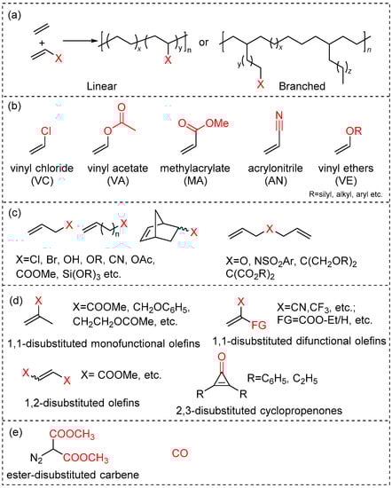 (a) Copolymerization of ethylene and polar monomers catalyzed by late transition metal and Common polar monomers involving (b) polar vinyl monomers; (c) polar allyl/norbornyl monomers and monomers with methylene spacers; (d) disubstituted monomers; (e) C1 monomers such as ester-disubstituted carbene and carbon monoxide (CO).