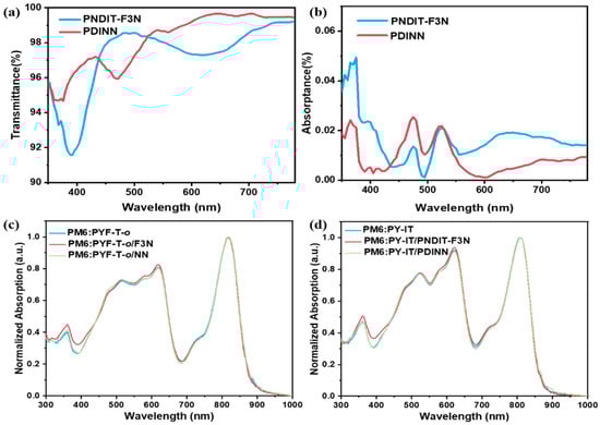 (a) UV-Vis transmittance spectra of PNDIT-F3N and PDINN. (b) UV-Vis absorption spectra of PNDIT-F3N and PDINN. (c,d) Absorption spectra of the active layers based on PYF-T-o and PY-IT, respectively.