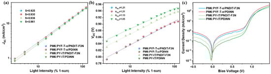 To investigate recombination, we first measured the J-V characteristics of the four devices under different light intensities (I). Figure 5a plots the relationship between JSC and light intensity. By linearly fitting the JSC versus light intensity data, we obtained the slope (S) for the four devices. The S values for the PM6:PYF-T-o/PNDIT-F3N, PM6:PYF-T-o/PDINN, PM6:PY-IT/PNDIT-F3N, and PM6:PY-IT/PDINN devices are 0.925, 0.930, 0.936, and 0.961, respectively. It is known that the closer S is to unity, the weaker the bimolecular recombination. Therefore, the smallest S for PM6:PY-IT/PDINN suggests the weakest bimolecular recombination in it, and among the four different devices, the trend of S is consistent with the trend of the FF of the devices.