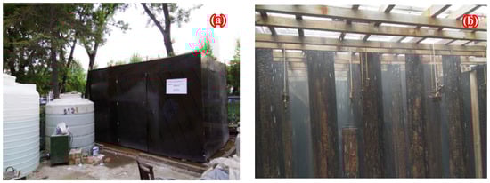 Walk-in natural environment accelerated corrosion test platform: (a) general view, (b) internal schematic diagram.