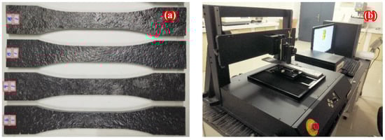 Dog-bone-shaped corroded steel plates were cut from the flanges of corroded H beams by wire-cut electrical discharge machining (WEDM), the corrosion products were removed carefully by electric wire brushing, and the dust and greasy dirt on the steel surface were cleaned using anhydrous alcohol. Figure 2a illustrates the corroded steel plates after removing corrosion products. To provide morphology data of the rusted steel surface for the subsequent stress concentration analysis of the corroded steel plates strengthened with and without CFRP plates, a surface morphology scanning test of the corroded steel plates was first conducted using a non-contact 3D profiler ST-400 produced by NANOVEA (Irvine, CA, USA). The profiler, as shown in Figure 2b, consists of an optical measuring probe, a controller, an optical sensor, 3D data acquisition software, a data processing system, etc. The high-resolution surface topography measurements and real-time collection and processing of the 3D coordinate data of each measurement point were realized by white light co-aggregation technology. Figure 2c presents the dimensions of the cut dog-bone specimen and the scanning area. As illustrated in Figure 2c, the length and width of the parallel section for the dog-bone specimen were 90 mm and 35 mm, respectively, and the scanning area located in the middle of the specimen had dimensions of 100 mm × 35 mm, where 100 mm was formed by extending 5 mm to both sides based on the length of the parallel section of the specimen. The scanning step of the rolling direction and flange width direction were both 100 um; three-dimensional coordinate data of 1001 × 351 points can be collected for each corroded steel surface.