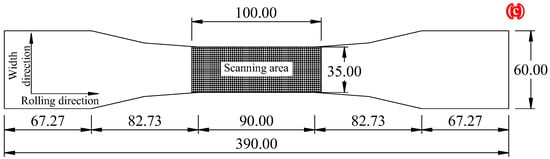 Three-dimensional surface profile measurements: (a) photograph of corroded steel plates after removing corrosion products, (b) photograph of surface morphology scanning test, (c) dimensions of cut dog-bone specimen and scanning area (mm).
