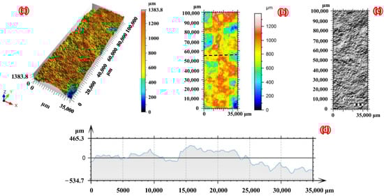 Figure 3 and Figure 4 clearly present the three-dimensional morphology scanning results of the corroded steel plates with a corrosion duration of 6 months and 18 months, respectively. As shown in Figure 3 and Figure 4, the surface corrosion morphology of corroded steel plates can be accurately restored using three-dimensional surface profile measurement technology. Moreover, the corroded steel substrates are covered with rust pits of different sizes due to uneven corrosion, which will inevitably lead to stress concentration in the steel plate. To quantitatively characterize the roughness of the corroded steel plates, the 3D roughness parameters, including the arithmetic mean height (Sa), the root mean square height (Sq), and the maximum height (Sz), are selected and calculated by applying the following equations []: