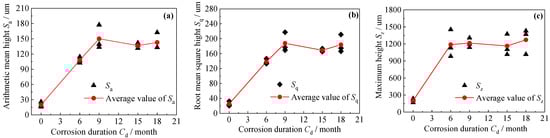 Effect of corrosion duration on the 3D roughness parameters: (a) arithmetic mean height Sa, (b) root mean square height Sq, and (c) maximum height Sz.