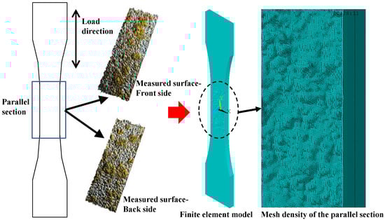 Figure 6 depicts the reproduction process of the surface morphology characteristics of corroded steel plates in the finite element models. As shown in Figure 6, the rusted steel plate is simulated by adopting double-layered variable-thickness shell element SHELL91, that is, the corroded steel plate is composed of two layers of variable-thickness shells that correspond to the front and back side of the measured surfaces, respectively. SHELL91 is an eight-node nonlinear structural shell element, of which each node has six degrees of freedom, i.e., the translational displacement freedom along the x, y, and z directions of the node coordinate system and the rotational displacement freedom around each axis. The node offset control of the upper and lower shell elements is carried out by applying the element characteristic parameters KEYOPT (11), that is, the node of the upper shell element is offset to the bottom surface of the element, whereas the node of the lower shell element is offset to the top surface of the element. Reproduction of the surface morphology characteristics of the corroded steel plates is realized by importing surface corrosion depth data obtained by morphology scanning and assigning them to the real constant of element SHELL 91.