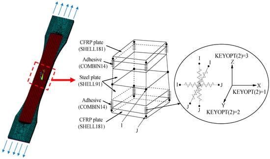 Figure 7 presents the element type and constraint relationship in the finite element models. As shown in Figure 7, the CFRP plate is simulated by the four-node shell element SHELL181 with equal thickness, and the adhesive layer between the CFRP plate and the corroded steel surface is simulated by the linear spring element COMBIN14, that is, three mutually perpendicular elements of COMBIN14 are inserted between the element nodes of the corroded steel plate and the CFRP plate, and the degree of freedom constraints in the x, y, and z directions is achieved by rewriting the element characteristic parameters KEYPOT (2).