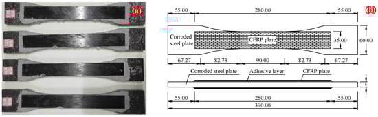 Prototype structures of the FEMs: (a) photograph of the specimens, (b) dimension and configuration of the corroded steel plate strengthened with CFRP plates.