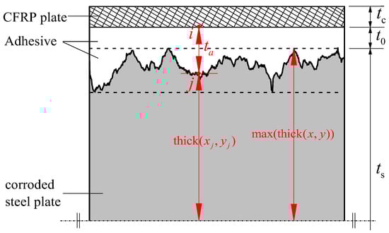 Figure 9 presents a diagrammatic sketch of the actual adhesive thickness corresponding to different positions on the surface of the corroded steel plate. Considering the uneven morphology of the steel plate surface caused by corrosion, the actual thickness of the corresponding adhesive layer of each spring element, which mainly depends on the intended adhesive thickness and corrosion depth, is different, and the actual thickness of the adhesive at the corresponding position of spring i-j can be obtained using the following equation: