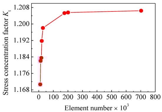 To assure the mesh model is accurate enough, a mesh convergence study was first carried out to ensure that the SCF in the pit region of the corroded steel plate was convergent before the series of stress concentration analyses. Several element numbers for the mesh size of the FEMs were performed for the corroded steel plate of C6-1, and the variation in SCF with respect to element number is presented in Figure 10. As shown in Figure 10, the SCF response is almost convergent for a mesh number of 200,000. In this study, the simulation models for the corroded steel plate strengthened with and without CFRP plates were constructed with nearly 341,000 and 260,000 elements, respectively.