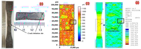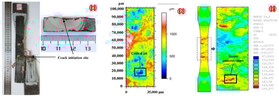 To further verify the reliability of the numerical modeling method based on the 3D topography data proposed in this paper, the fatigue test results of specimens C6-U-S1 and C9-DS1-A in the authors’ recent study [] were adopted for comparison with the three-dimensional morphology scanning and FEM results in this paper (see Figure 11 and Figure 12, respectively, where specimen C6-U-S1 is a bare corroded steel plate without any patch, and specimen C9-DS1-A is a corroded steel plate double-side patched with CFRP plates with a thickness of 1.4 mm). As shown in Figure 11 and Figure 12, the fatigue crack initiation site on the corroded steel plates strengthened with and without CFRP plates and the critical pit (i.e., the rust pit corresponding to the maximum pit depth) on the 3D surface topography present an excellent correlation with the stress concentration site in FEMs. This indicates that the FEMs applied in the present study can reproduce the surface morphology of the corroded steel plate and predict the location of stress concentration with reasonable accuracy.