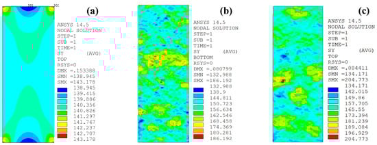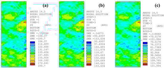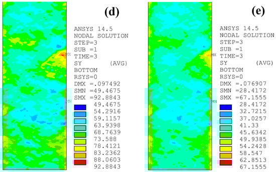 The corroded steel plate strengthened with and without CFRP plates is subjected to a uniaxial tensile load at both ends. Unless otherwise specified, the tensile load applied to the models is 52.8 kN, which corresponds to the average value of the fatigue load adopted in the authors’ recent study []. The prestress of the CFRP plate, which is one of the main factors to be considered in the stress concentration analysis, is achieved by applying the temperature load to the CFRP plate, and the temperature load can be calculated by the following equation: