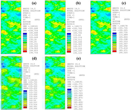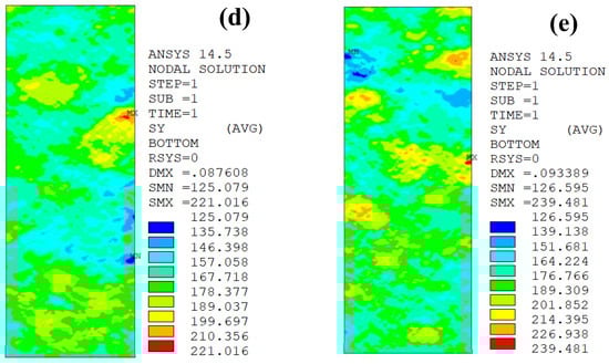 Peak tensile stress distribution on the corroded steel surfaces of the patched specimens with various adhesive thicknesses: (a) C18-DS1.0-A0.5, (b) C18-DS1.0-A1.0, (c) C18-DS1.0-A1.5, (d) C18-DS1.0-A2.0, (e) C18-DS1.0-A2.5.