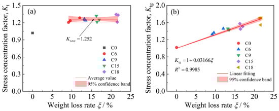Figure 14a,b illustrates the effect of the corrosion duration on the stress concentration factors Kt and Ktg of the unpatched corroded steel plate, respectively. As shown in Figure 14a, the stress concentration factor (Kt) presents a significant increase with the corrosion duration increased from 0 month to 6 months. The corrosion duration continues to increase from 6 months to 18 months; however, it fluctuates up and down with no obvious tendency, and even the stress concentration factor (Kt) of the corroded steel plate with the same corrosion duration shows a large dispersion. The value of Kt for the unpatched corroded steel plate with a corrosion duration of 6~18 months and a weight loss rate of 9.16~21.78% are approximately 1.205~1.343, the mean value is 1.252, and the upper and lower limit of the 95% confidence interval are 1.231 and 1.293, respectively. The convert stress concentration factor (Ktg) of the unpatched corroded steel plate, as shown in Figure 14b, increases significantly with the increase in corrosion duration, and it presents a good linear relationship with the weight loss rate of the corroded steel plates: