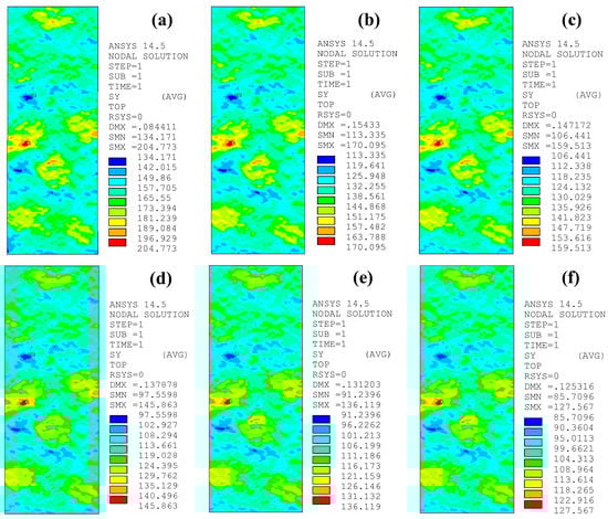 Peak tensile stress distribution on the corroded steel surfaces of the patched specimens with various CFRP strengthening stiffnesses: (a) C9-1, (b) C9-DS1.0-A1.0, (c) C9-DS1.4-A1.0, (d) C9-DS2.0-A1.0, (e) C9-DS2.5-A1.0, (f) C9-DS3.0-A1.0.