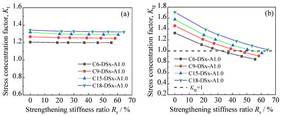 Influence of strengthening stiffness ratio on the stress concentration factors (a) Kt and (b) Ktg of the corroded steel plates strengthened with CFRP plates.