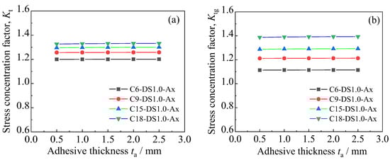 Effect of adhesive thickness on the stress concentration factors (a) Kt and (b) Ktg of the corroded steel plates strengthened with CFRP plates.