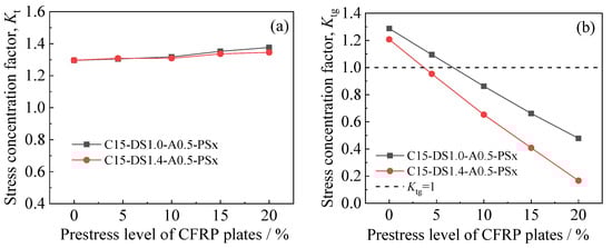 Figure 20a,b presents the effect of the prestress level of the CFRP plates on the stress concentration factors Kt and Ktg of the corroded steel plates strengthened with CFRP plates, respectively. As shown in Figure 20a, with respect to the external patched specimens with the same corrosion duration and different strengthening stiffnesses and prestress levels of CFRP plates, the stress concentration factor (Kt) is basically the same, indicating that Kt mainly depends on the surface morphology of the corroded steel plate and is hardly affected by the stiffness and prestress level of the external patched CFRP plates. It can be seen in Figure 20b that the converted stress concentration factor (Ktg) presents a considerable decrease with the increase in the prestress level of the CFRP plates, and the greater the strengthening stiffness of the CFRP plates, the more significant the decrease amplitude of Ktg. Taking the specimens with strengthening stiffnesses of 20.15% (i.e., C15-DS1.0-A0.5-PSx series specimens) and 28.21% (i.e., C15-DS1.4-A0.5-PSx series specimens) as an example, with the prestress level of CFRP plates increasing from 0 to 20%, the corresponding value of Ktg decreases from 1.288 and 1.208 to 0.479 and 0.167, with an amplitude of 62.81% and 86.18, respectively. The aforementioned phenomenon shows that the prestressing of CFRP plates, especially for specimens with a large strengthening stiffness ratio, has a significant impact on reducing the peak tensile stress of the corroded steel plate strengthened with CFRP plates. The larger the prestress level, the higher the utilization efficiency of the CFRP plates and the more significant the strengthening effectiveness of the corroded steel plate strengthened with CFRP plates.