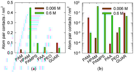 Surface contact between pairs of polymer atoms and the kaolinite surface (010) at pH 7 at 300 K and in the presence of NaCl. (a) Linear scale; (b) logarithmic scale.