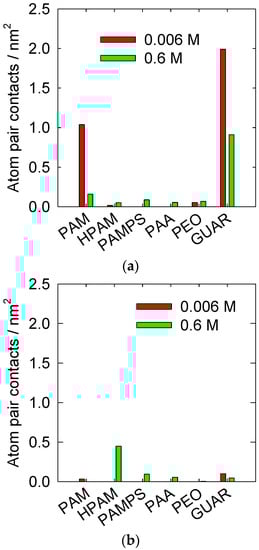 Adsorption at a low salt concentration mainly occurs with PAM and GUAR, with values of 0.04 and 0.1 nm−2, respectively. When no salts are present, neutral polymers are more likely to be adsorbed on the surface. However, in the case of PEO, this does not occur, possibly due to its ether groups, which have a greater preference to form bridges with themselves or water [].