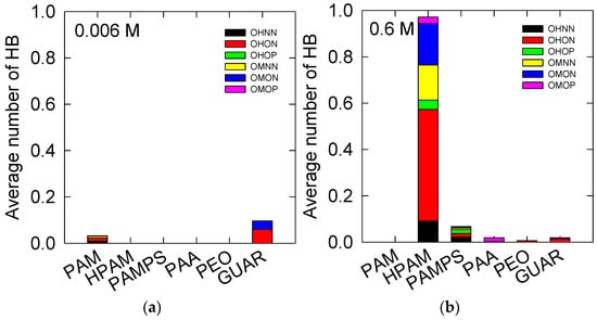 The time average of the HB between the polymers and the kaolinite surface (010). At salt concentrations of (a) 0.006 M and (b) 0.6 M of NaCl. See Figure 3 for legends.
