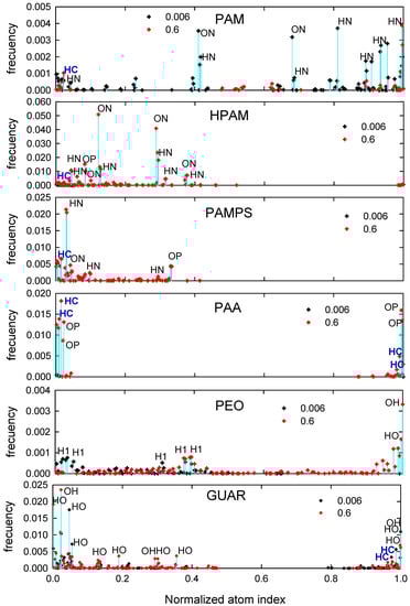 In this section, the contact distributions between the surface and the polymers are determined, in order to inspect with which atoms and at what chain positions the adsorptions mainly occur. The distributions are presented in Figure 5, where labels of the types of atoms were placed according to the frequency of contacts.