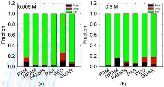 In the case of 0.6 M salt concentration, we see that the most adsorbed HPAM polymer presents an interaction without loops but with the most significant portion of train (18%). This indicates that its adsorption is strong and continuous on the adsorbed sites. It has been observed that, at pH 11, the formation of the train increases, and the formation of loops also appears []. For PAMPS cases, a lower amount of train is observed than for HPAM (~6%), but loops (4%) are present due to the pendant group of PAMPS, which is more extensive. PAA shows a similar presence of trains as PAMPS, but no loops, possibly because its pendant group is small. GUAR shows a high formation of loops (12%) and a low formation of trains (4%), which is due to its larger volumetric size and lower capacity to bend []. For PAM and PEO, their behaviors are shown in Figure 5, whereby PAM has low interaction and, therefore, low train formation (~2%); in the case of PEO, there is generalized adsorption along the chain, and this generates a large formation of loops (10%).