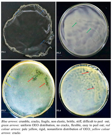 Visual assessment of films: control or FL1 (CA+SA); FL2: CA + SA + OEO (1.5% v/v); FL3: CA + SA + OEO (2% v/v); FL4: CA + SA + OEO (2.5% v/v).
