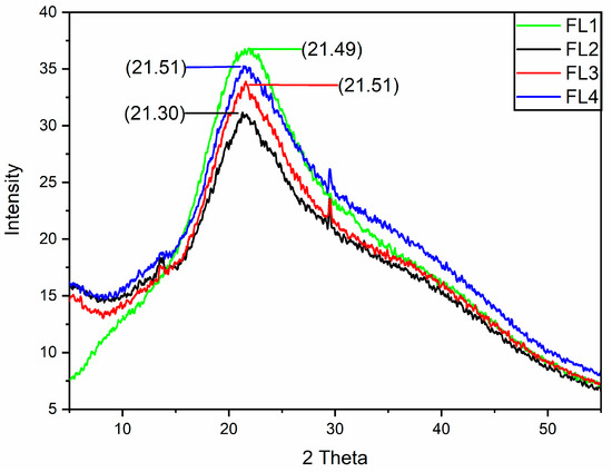 XRD analysis of FL1–FL4 samples: control or FL1 (CA + SA); FL2: CA + SA + OEO (1.5% v/v); FL3: CA + SA + OEO (2% v/v); FL4: CA + SA + OEO (2.5% v/v).