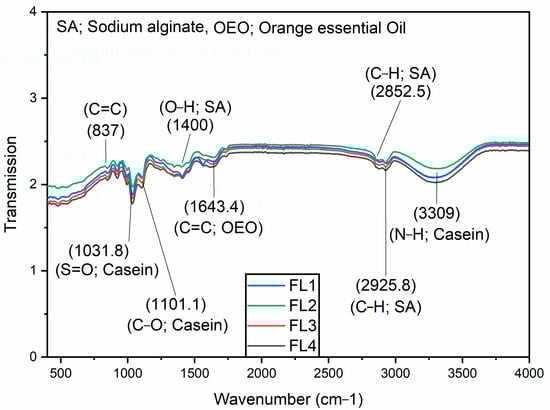 FTIR analysis of FL1–FL4 composite films samples: control or FL1 (CA + SA); FL2: CA + SA + OEO (1.5% v/v); FL3: CA + SA + OEO (2% v/v); FL4: CA + SA + OEO (2.5% v/v).