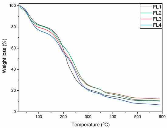 TGA thermograms of FL1–FL4 composite films samples: control or FL1 (CA + SA); FL2: CA + SA + OEO (1.5% v/v); FL3: CA + SA + OEO (2% v/v); FL4: CA + SA + OEO (2.5% v/v).