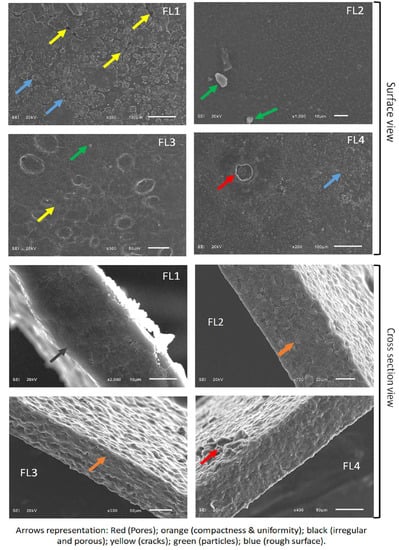 Surface morphology is based on the chemical interaction between film components, which considerably impacts the overall properties of the film [45]. Thus, to establish a relationship between morphological features and the performance of the film, an SEM investigation was conducted. Surface as well as cross-section images of CA–SA and OEO–CA–SA films are illustrated in Figure 5. The surface of the CA–SA films (FL1) was rough and uneven with cracks, whereas CA–SA films (FL2) containing 1.5% OEO have smooth surfaces with few particles. However, CA–SA films containing 2–2.5% OEO (FL2, FL3) present large size holes, possibly due to the volatilization of free OEO. Additionally, the films containing 2–2.5% OEO revealed a rough surface with minor fractures and wrinkles as well as big holes. These defects at the films’ surface could be ascribed to the emulsification, flocculation, and coalescence of OEO in the fabricated material during drying, leading to droplet formation and volatilization of OEO [46]. On other hand, CA–SA films containing 1.5% OEO (FL2) showed uniform and compact structure with a smooth surface and without any cracks and pores. It was assumed that OEO addition (1.5%) caused a modification in the structural organization of the film, which could be associated with changes in WVP and TS values.