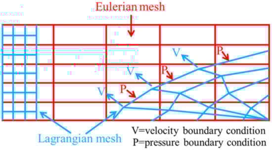 Figure 2 shows a schematic diagram of the CEL method, which is a more commonly used finite element method. In this method, the Eulerian material can impose pressure boundary conditions on the Lagrange mesh, displacing the structure, and the Lagrange interface can pass through the spatially fixed Eulerian mesh in an arbitrary manner. In turn, the Lagrange interface provides velocity boundary conditions for the Eulerian material flow, which cannot penetrate the Lagrange mesh [,]. The CEL method is characterized by high computational efficiency.