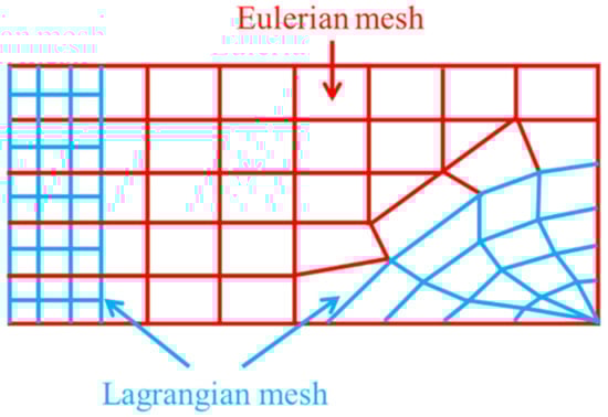 Figure 3 shows the schematic diagram of the ALE coupling method, which also combines the advantages of the Lagrange and Eulerian algorithms []. Firstly, it introduces the features of the Lagrange method in the processing of the structural boundary motion so that it can effectively track the motion of the material structure boundary. Secondly, in the division of the internal mesh, it absorbs the advantages of the Eulerian method so that the internal mesh exists independently of the material entity. However, it is not exactly the same as the Eulerian mesh, and the mesh can be properly adjusted in the solution process according to the defined parameters so that the mesh does not have serious distortion. This method is very advantageous when analyzing problems with large deformations of solids, and the material can flow between the meshes when using this method.