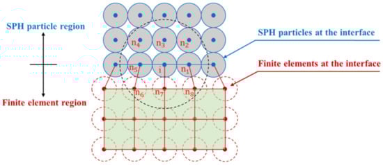 The solution process of the SPH–FEM coupling method is shown in Figure 5. In each time step, the mass, position, velocity, and stress of the finite element node are passed to the corresponding background particle. After ending each time step, the position and velocity of the SPH particle at the interface are passed to the corresponding finite element node. The integration of velocity, displacement, and energy of particle i is calculated considering both particles n1, n2, n3, n4, n5 and finite element nodes n6, n7, and n8. The background particles are searched by the SPH particles and do not perform SPH numerical integration themselves, and the update of data is performed by the corresponding finite element nodes. The SPH particles provide boundary conditions for the finite elements, while the finite elements enable the SPH particles to avoid boundary effects and maintain the continuity between the SPH particles and the finite elements [].