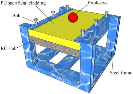 With the continuous occurrence of terrorist attacks, local armed conflicts, and accidental explosions throughout the world, explosive loads have posed a major threat to the safety of engineering structures []. Reinforced concrete slabs have been widely used worldwide as the main components of engineering structures. However, blast loads, especially contact blast loads, may cause significant damage to reinforced concrete slabs. The reinforced concrete slabs under contact blast can be severely damaged by burst craters, large deformations, spalling and even penetration. Therefore, to prevent serious damage to reinforced concrete structures, the use of reasonable protection techniques to mitigate the damage effects of contact blast loads on structures is a pivotal issue.