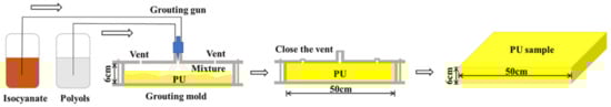 Figure 7 shows the preparation process of PU specimens. The PU specimens used are generated by mixing isocyanate and polyol [] in a weight ratio of 1:1 and then reacting []. The density of the prepared specimen is 0.2 g/cm3. The design shape is a square plate with dimensions of 50 cm × 50 cm × 6 cm. The Young’s modulus is 35.81 MPa, the elastic limit is 1.54 MPa, and the yield strength is 2.04 MPa.