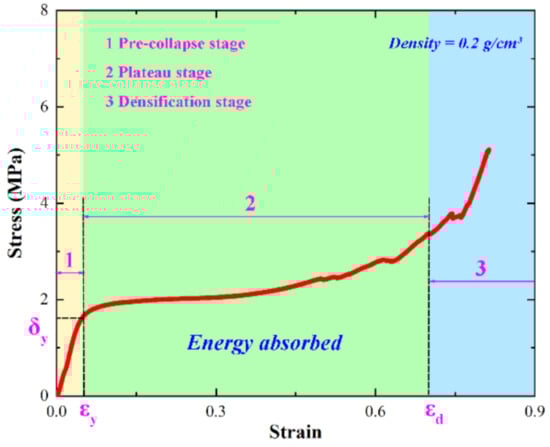 It is well known that the overall energy absorption capacity of the sacrificial cladding is mainly determined by the yield plateau in its stress–strain curve. As shown in Figure 8, the stress–strain curve of non-water reactive foamed polyurethane is mainly divided into three stages, which we refer to as the pre-collapse stage, the plateau stage, and the densification stage, respectively. In Figure 8, and are the yield stress and yield strain, respectively, and is the densification strain. It is not difficult to find that there is a rather long yield plateau between the yield strain and the densification strain . This indicates that the non-water reactive foamed polyurethane has a strong energy absorption capacity and has the potential to act as sacrificial cladding.