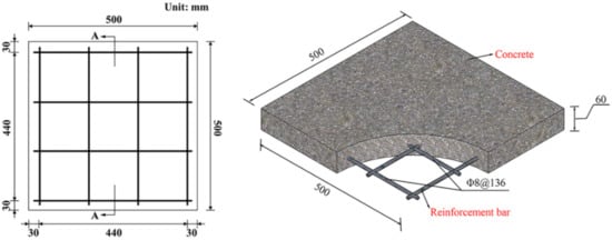Figure 9 shows the geometric dimensions and reinforcement arrangement of the reinforced concrete slab, and its design size is 500 mm × 500 mm × 60 mm. The strength grade of the selected concrete material is C35, in which the average compressive strength of the concrete is 36 MPa, the tensile strength is 4.0 MPa, and the Young’s modulus is 32 GPa. The strength grade of the reinforcement bar used is HRB400, so the yield strength of the steel bar is 400 MPa. The elastic modulus is 200 GPa. The diameter of the steel bar is 8 mm. The single-layer and two-way reinforcement are arranged, and the thickness of the protective layer of the reinforcement bar is 30 mm.