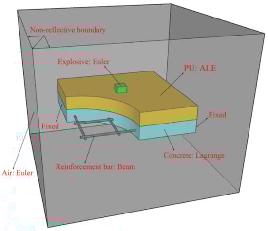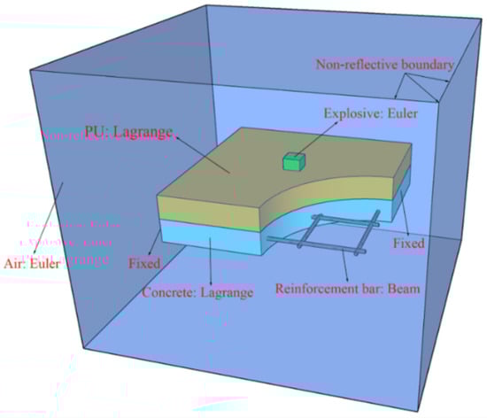 Figure 10 shows the established CEL model. The air is modeled using a Euler subgrid with a mesh size of 10 mm, and the explosive is filled in the Euler meshes. Both the polyurethane sacrificial cladding and the concrete slab are modeled using a Lagrange subgrid with a mesh size of 5 mm. In addition, the reinforcement bars are modeled by beam elements with a mesh size of 5 mm. Shared nodes connections are used between the steel and concrete, and they are assumed to be fully bonded without any slippage. Fixed boundaries are imposed at both ends of the PU–RCS. The boundary condition of the Euler mesh is set as an outflow boundary, i.e., no shock waves are allowed to be reflected at the boundaries of the air domain.