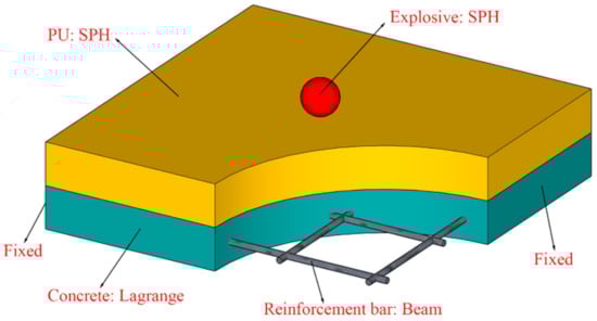 Figure 12 shows the established SPH–FEM coupling model. In this model, the explosive and the polyurethane sacrificial cladding are modeled by SPH particles. The diameters of the SPH particles constituting the explosive and polyurethane sacrificial cladding are both 5 mm. The concrete is still modeled by the Lagrange subgrid, and the reinforcement bars are modeled by the beam elements, and the size and number of the Lagrange and beam meshes are kept the same as the first two FEM models. It is worth mentioning that air is not considered in the SPH–FEM coupling model. As for the contact explosion, the explosive directly contacts the target structure, so after the explosion, it is mainly the detonation products that damage the target structure. However, the impact of air shock wave on the target structure is relatively small []. A fixed boundary is still imposed at both ends of the PU–RCS. Shared node connections are also used between the reinforcement bar and concrete.