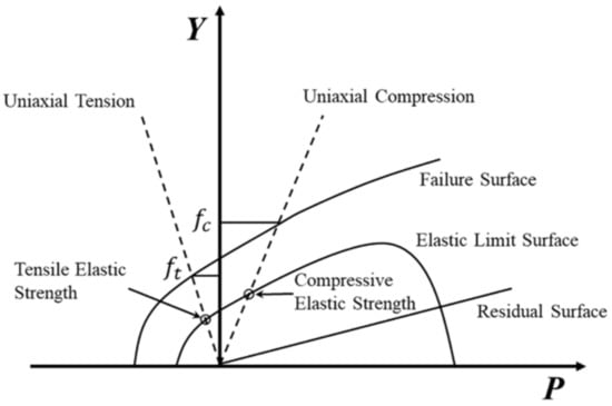 In this study, the RHT dynamic damage model was used to describe the behavior of concrete []. As shown in Figure 13, the RHT model consists of three pressure-dependent surfaces in the stress space, which are the different limit states of the yield surface: the elastic limit, the failure, and the residual strength, respectively [].