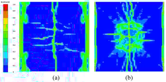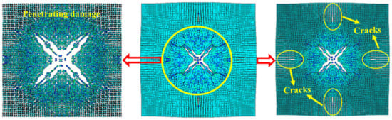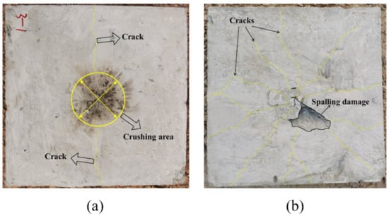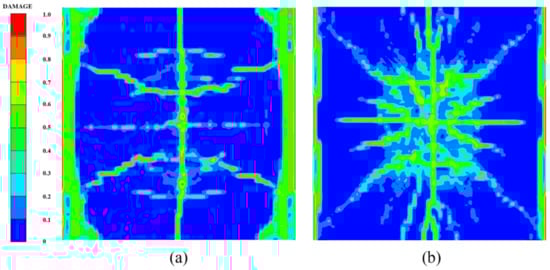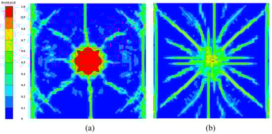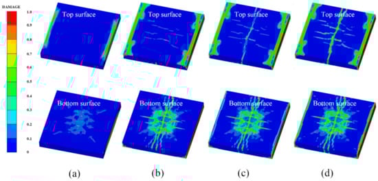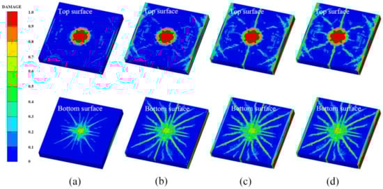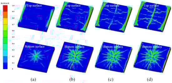Figure 14 shows the damage features of the top and bottom surfaces of PU–RCS calculated by the above three coupled models, respectively. It is worth noting that Figure 14, Figure 15 and Figure 16 show the damage results of the reinforced concrete slab after removing the PU sacrificial cladding.